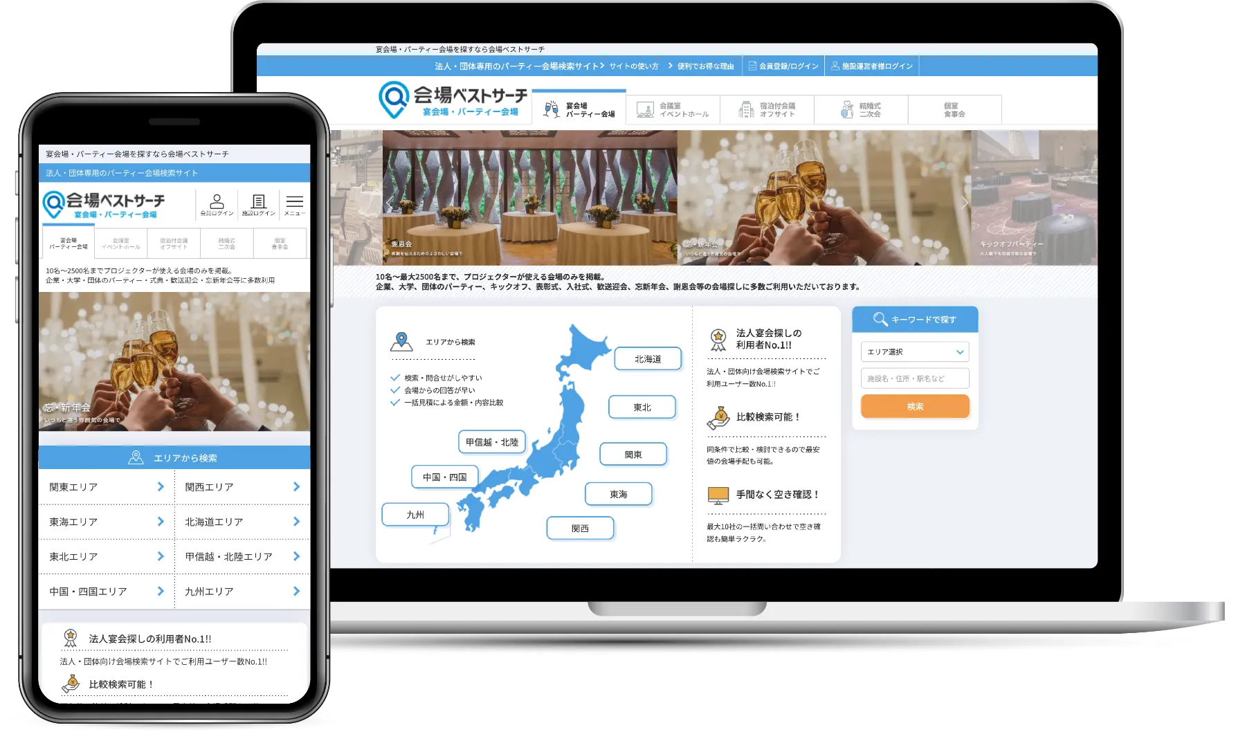 会場ベストサーチは大人数で実施するイベント会場の検索サイト。宴会場・パーティー会場(企業表彰式・忘新年会・同窓会など)、会議室・イベントホール(セミナー・研修)、宿泊付会議・オフサイト(宿泊研修・経営合宿)、結婚式二次会、ホテル・レストラン個室(お祝い、法事)まで、さまざまシーンで会場探しが可能。